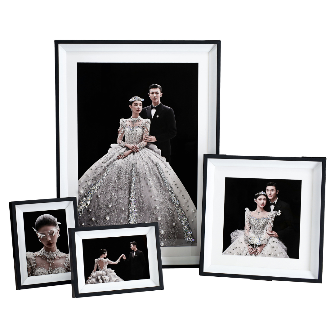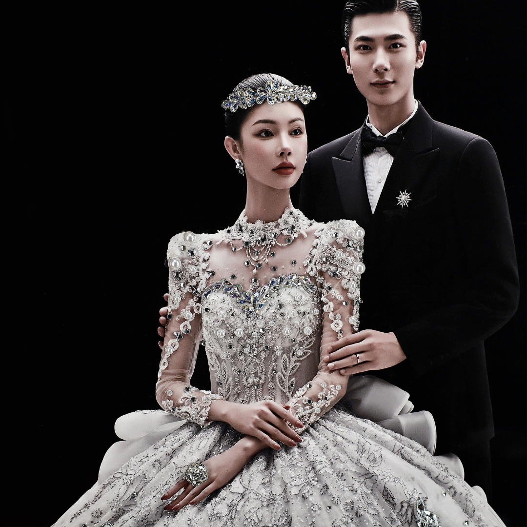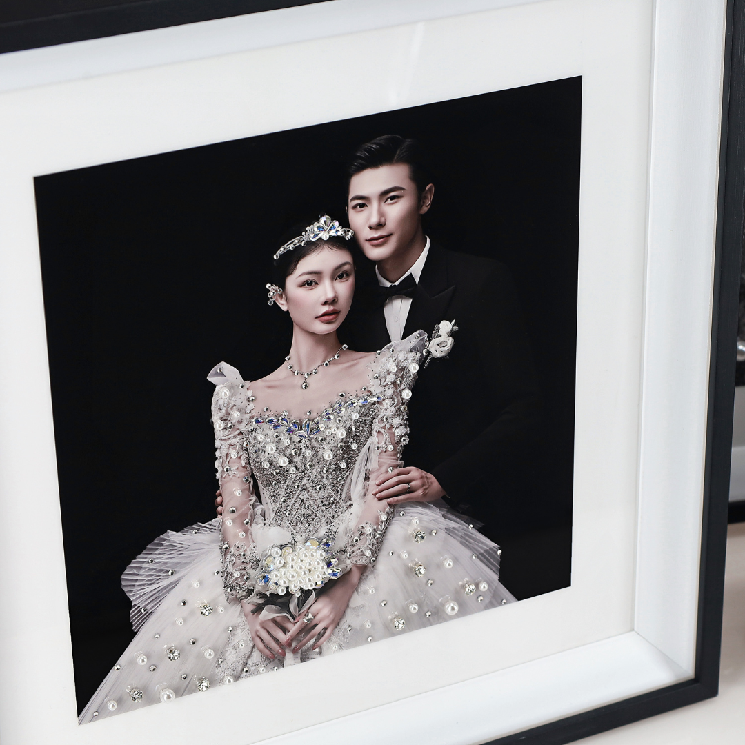 Every piece is meticulously handcrafted using over 500 luxurious materials—pearls, rhinestones, crystals, natural stones, acrylics, glass beads, and more. Paired with over 100 designer fabrics including American mesh, Korean tulle, pearl lace, and pleated gauze, each artwork is uniquely styled to reflect your photo’s story.
